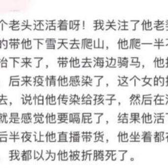 【张纪中 很难杀的一位中国男人】 73岁正式闯的年纪是吧! 网友发现张纪中的老婆杜星霖真的很能折腾他。比如半夜三点,突然跟他说想去新疆吃羊肉串,于是立刻订票飞过去; 比如下雪天带张纪中爬山,爬到一半张纪中不行了,直接被抬下来; 比如和张纪中去海边骑马,张纪中直接摔下马; 再比如直播带货到深夜,张纪中带到一般晕了,杜星霖也不管他,还说没关系他一会儿就行了。 网友辣评:张纪中,很难杀的一位中国男人
